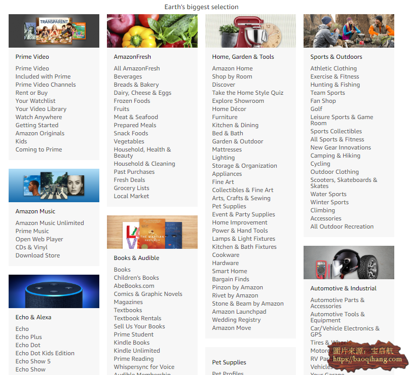 要明白niche利基,亚马逊给我们提供了很好的教材,我先给你一张美国亚马逊网站商品分类目录截图: