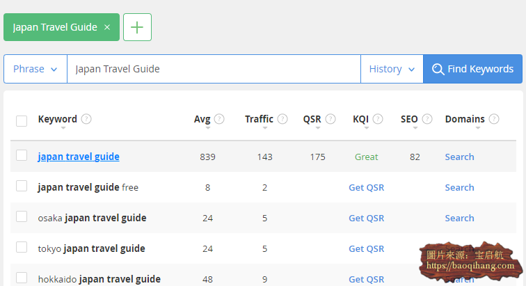 在这里我再举一个例子来说明一下niche就是解决问题的方法,假如你近期想去日期旅游,并且也是第一次去,那么你可能会在网上搜索Japan Travel Guide,如果没有这方面的文章,你可以利用这个英文关键字建立一个网站,帮助需要到日本去旅游的朋友做一些事前功课。如果您是WA会员,可以使用Jaaxy这个关键字工具免费查询,当然,我是会员不限次数,你可以通过Jaaxy这个关键字工具查看该关键字的QSR值(竞争力度数据),看下图所示:
